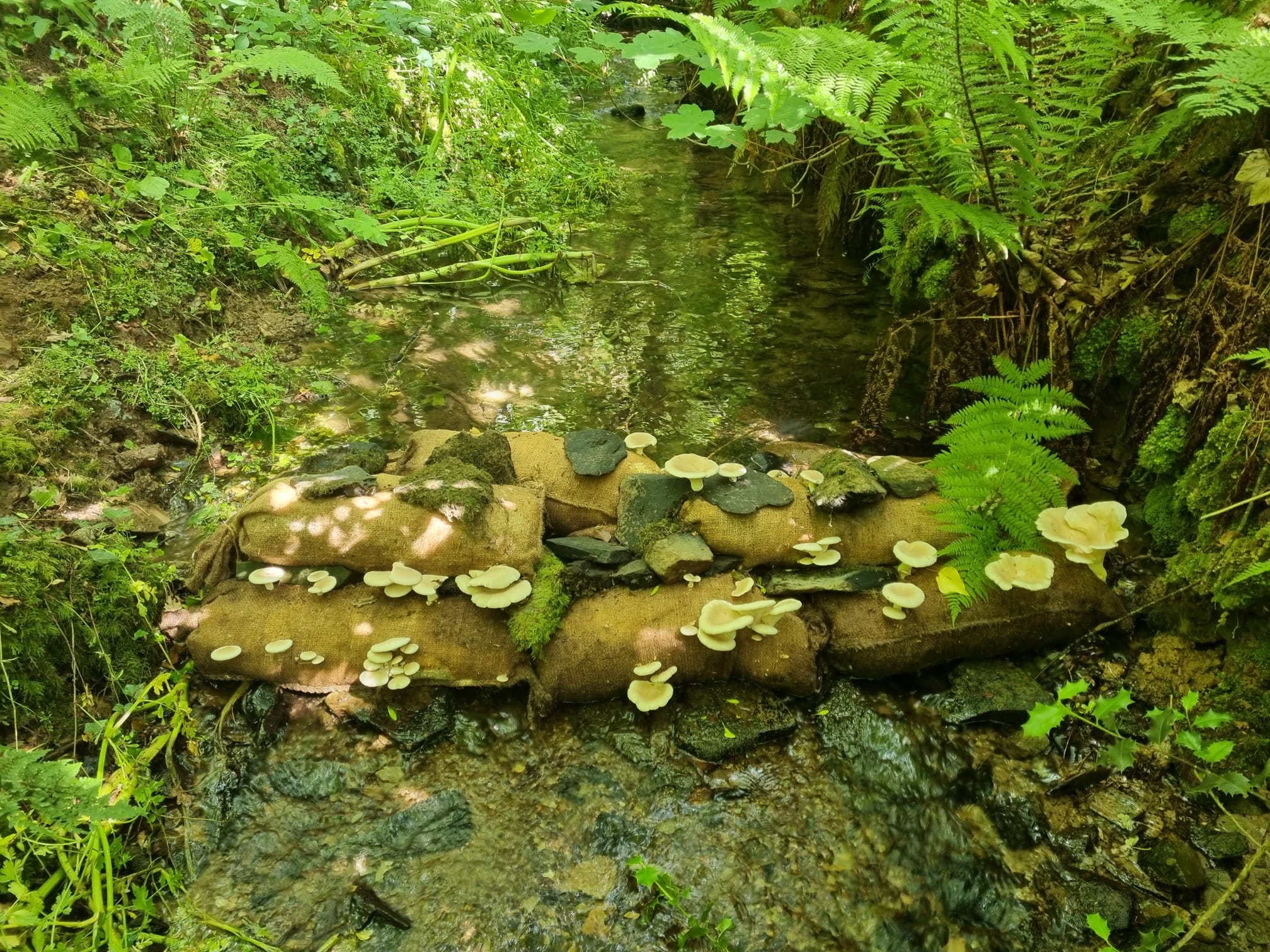Although there’s extensive and positive results in laboratory conditions that prove fungi can support the wellbeing and cleaning of both soil and water, much more testing is needed in the real (and highly complex) world.  Flete Field Lab are currently the only organisation doing these trials in real life in England – and the results so far, during our short summer trials, have shown up to a 47% removal of e.Coli in a small brook leading into the Erme River.